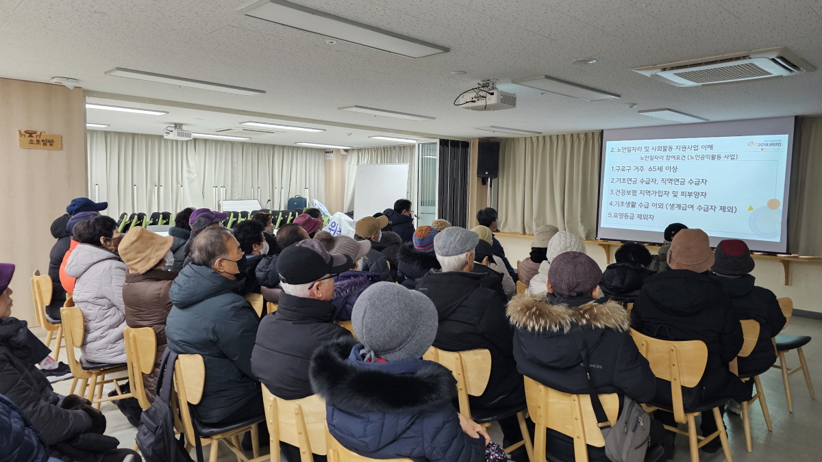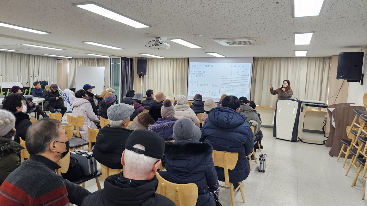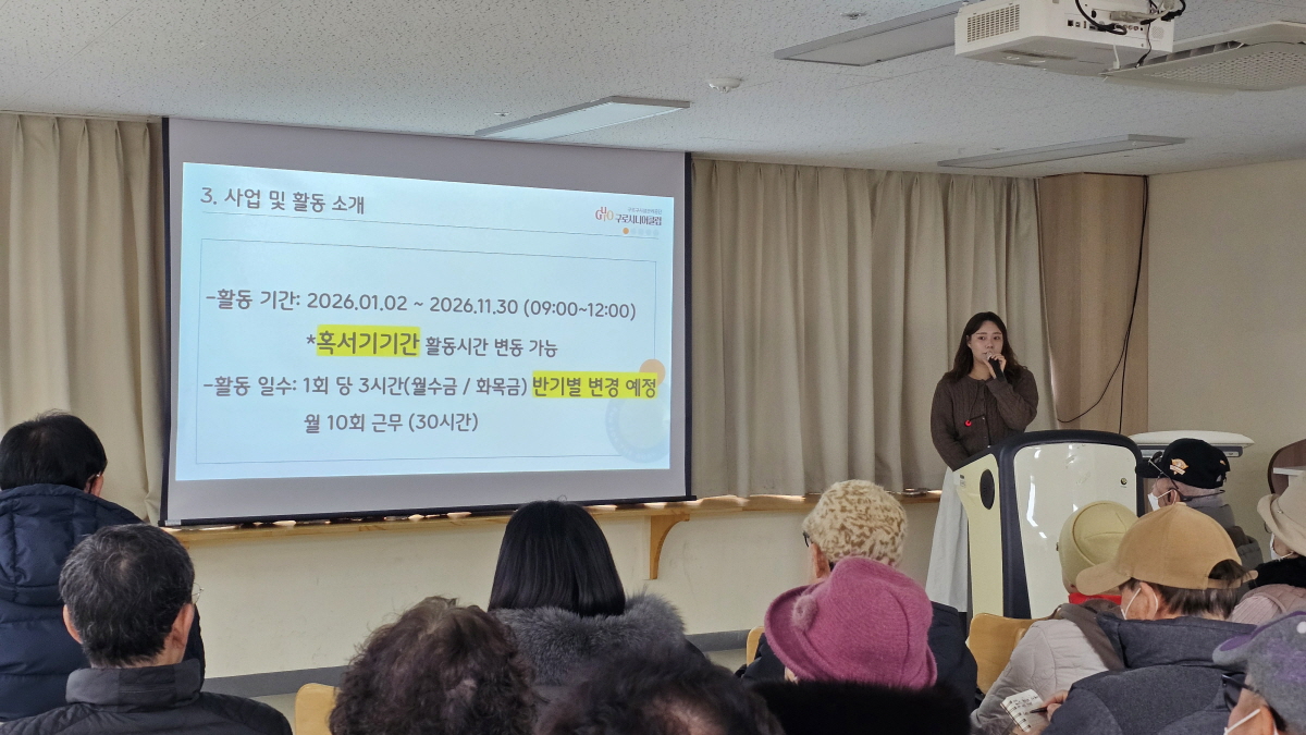 2026년 노인공익활동사업 직무교육이 1월 12일 오전 9시, 1월 13일 오후 14시 오류문화센터 3층 다목적실에서 진행되었으며